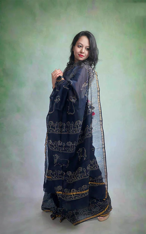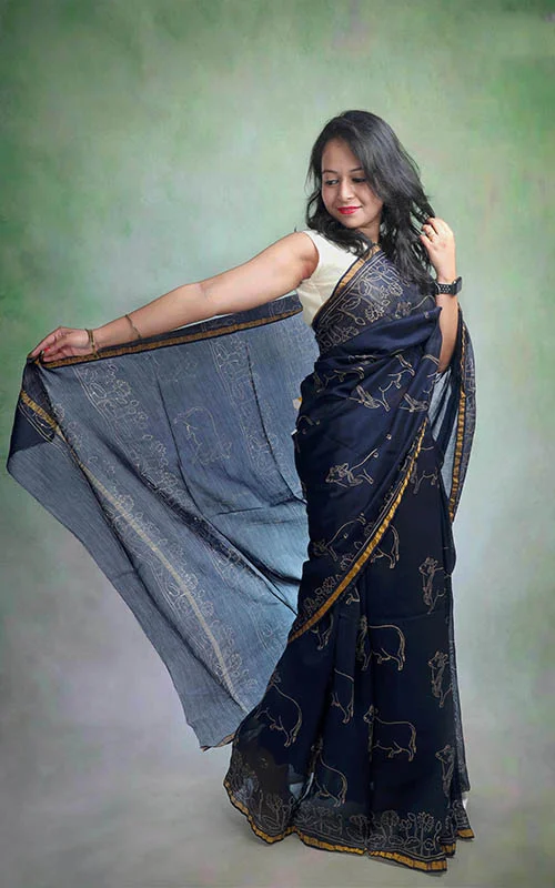Maheshwari Saree with Pichwai Block Print-Blue